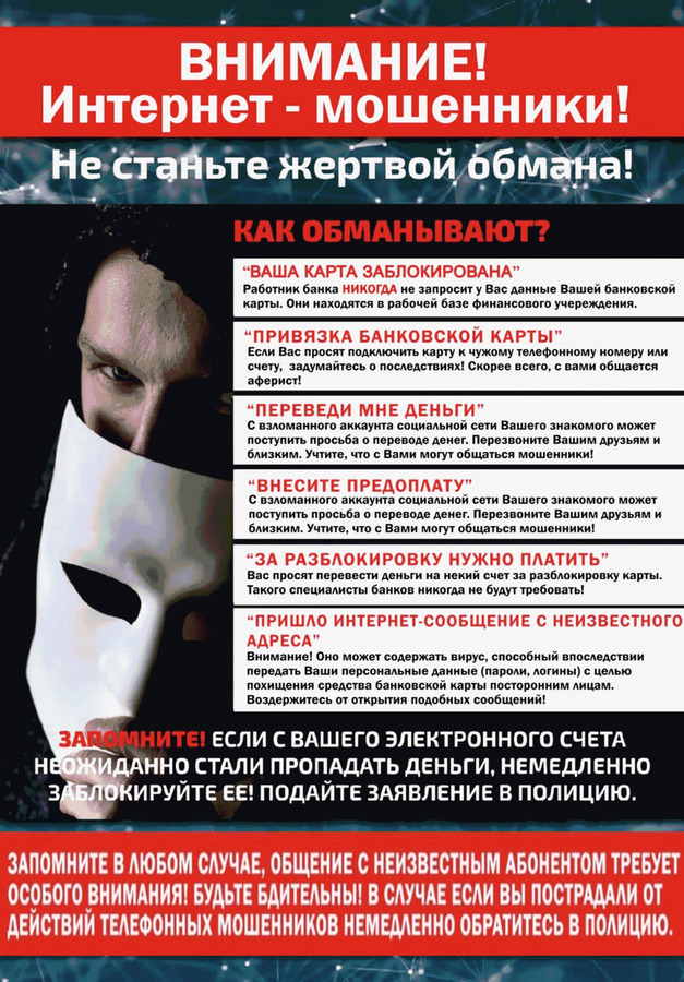 В последние время на территории Российской Федерации, и, в частности, в Кемеровской области зафиксирован рост нового вида мошенничества! Для общения с потенциальной жертвой мошенники используют либо SMS, либо телефонный звонок. SMS – это мошенничество «вслепую»: такие сообщения рассылаются в большом объёме – в надежде на доверчивого получателя. Телефонный звонок позволяет манипулировать человеком при разговоре, но при таком общении можно разоблачить мошенника правильным вопросом. Цель мошенников – заставить Вас передать свои денежные средства «добровольно». Для этого используются различные схемы мошенничества. Изъятие денежных средств может проходить разными способами. Вас попытаются заставить: Передать деньги из рук в руки или оставить в условленном месте. Приобрести карты экспресс-оплаты и сообщить мошеннику коды карты. Перевести деньги на свой счёт и ввести специальный код. Перевести деньги на указанный счёт. ... Читать дальше » |