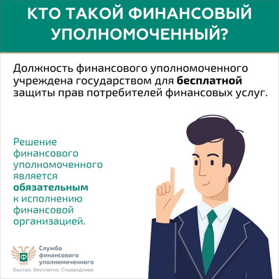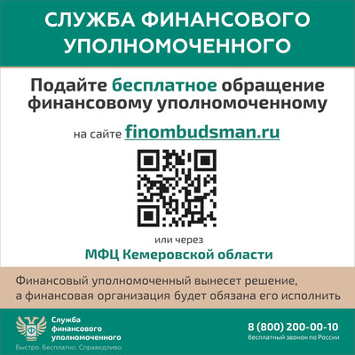 Финансовый уполномоченный решает имущественные (например, денежные) споры без суда между финансовыми организациями и их клиентами – физическими лицами. Это обязательный порядок решения споров по закону. Не нужно терять время и деньги на экспертизы и юристов. Вся процедура бесплатная: от приема обращения до принятия решения. Ваши обращения финансовый уполномоченный рассматривает 15 рабочих дней (по спорам, связанным с неправомерным переводом пенсионных накоплений, – 20 рабочих дней) – без вашего визита. Никуда не нужно ходить. Решение финансового уполномоченного обязательно для исполнения финансовой организацией. Вы можете подать обращение в отношении страховой компании, банка, микрофинансовой организации, негосударственного пенсионного фонда, ломбарда и кредитного потребительского кооператива. Проверьте свой спор на официальном сайте финансового уполномоченного finombudsman.ru: подлежит ли он рассмотрению финансовым уполномоченным? Это можно сделать, ответив всего на несколько простых вопросов. Перед подачей обращения финансовому уполномоченному – направьте заявление о восстановлении нарушенного права (претензию) в финансовую организацию, с которой у вас возник имущественный (например, денежный) спор. Если спор с финансовой организацией не урегулирован – подайте обращение финансовому уполномоченному на его официальном сайте или через МФЦ Кемеровской области. Более подробную информацию вы можете получить здесь. | |